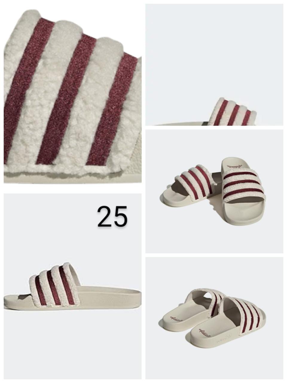 Sandalias tipo slide, beige/crema con franjas vino, talla 25.